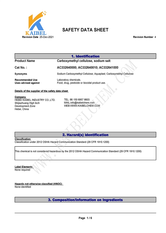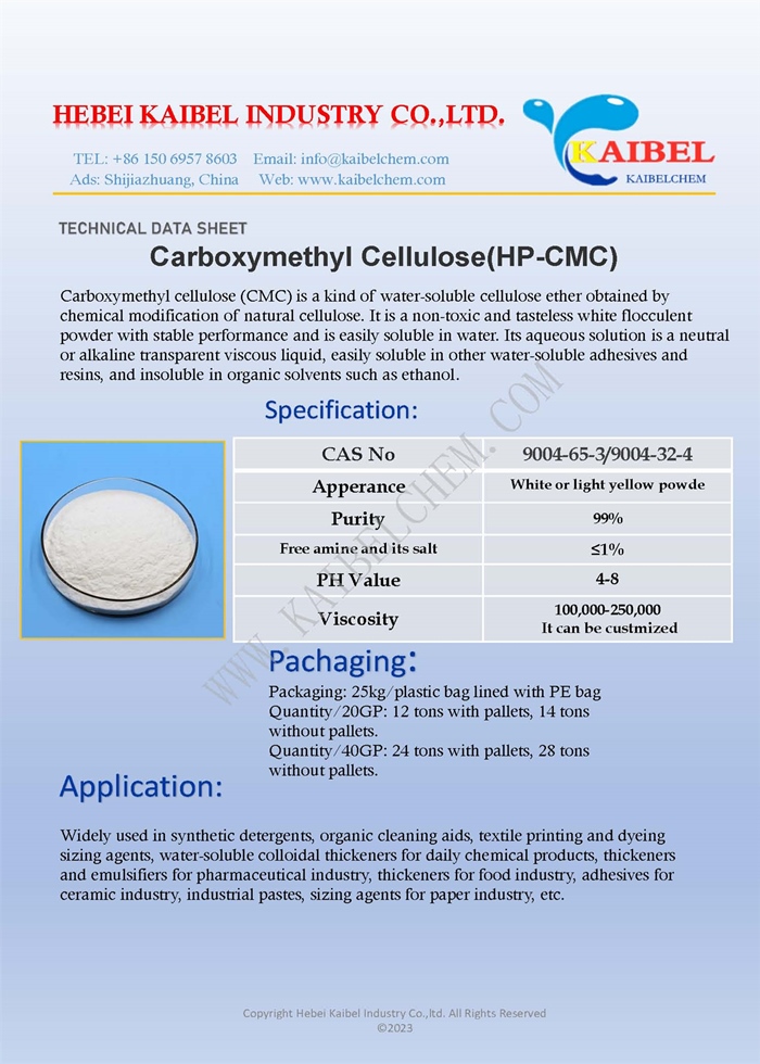 Carboxymethyl cellulose (CMC) is a non-toxic and odorless white flocculent powder with stable performance and easy solubility in water. Its aqueous solution is a neutral or alkaline transparent viscous liquid, soluble in other water-soluble adhesives and resins, and insoluble in organic solvents such as ethanol. CMC can be used as an adhesive, thickener, suspension agent, emulsifier, dispersant, stabilizer, sizing agent.