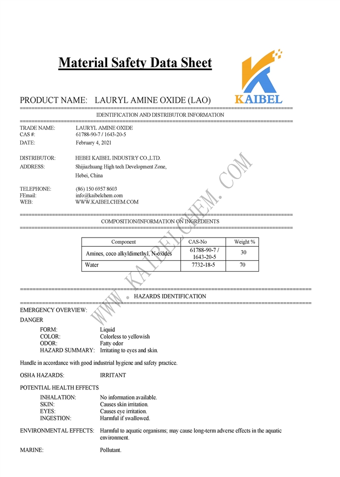 Amine oxide (OA) is an oxide that directly combines oxygen with nitrogen atoms in tertiary amine molecules. The weak alkalinity of amine oxide makes it exhibit non ionic properties in neutral and alkaline solutions, and cationic in acidic media. It is a multifunctional amphoteric surfactant.