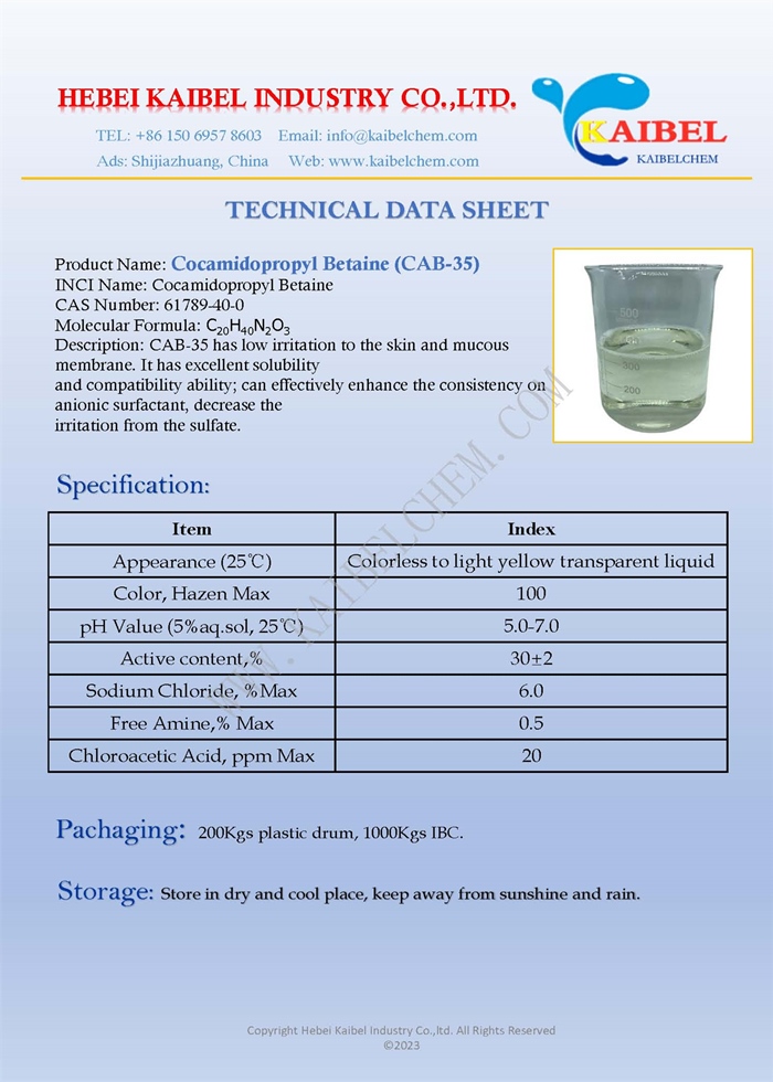 Cocamidopropyl betaine (CAB) is used in many personal care and household products as a surfactant, foam enhancer, and thickening agent.Skin care: As a medium-strength surfactant in bath and body products, removing oil from the skin. It is used as a foam enhancer in body washes and as an emulsifying agent in cosmetics Hair care: It eliminates oil from hair. Cocamidopropyl betaine in shampoos works as a foam booster and creates a rich lather after coming in contact with water. It adds viscosity to hair conditioners and makes them creamier and richer. It also serves as an antistatic agent in hair conditioners