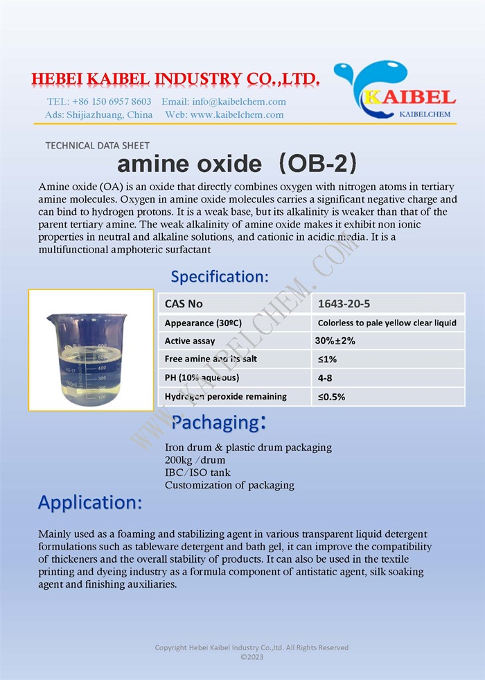 Amine oxide (OA) is an oxide that directly combines oxygen with nitrogen atoms in tertiary amine molecules. The weak alkalinity of amine oxide makes it exhibit non ionic properties in neutral and alkaline solutions, and cationic in acidic media. It is a multifunctional amphoteric surfactant.